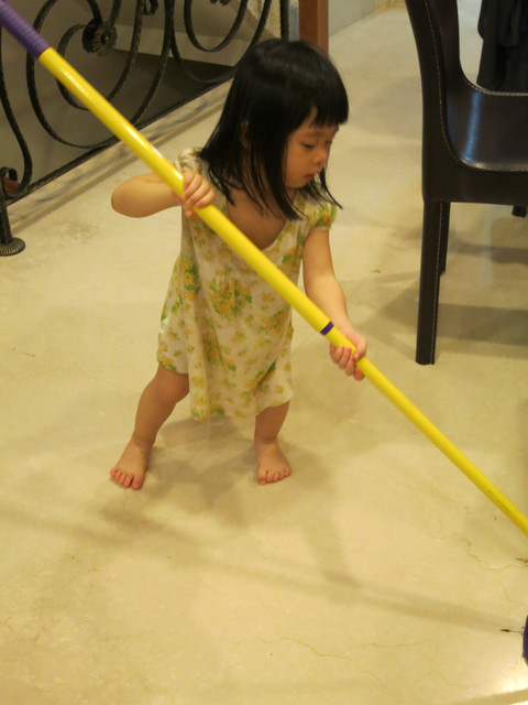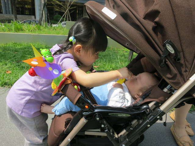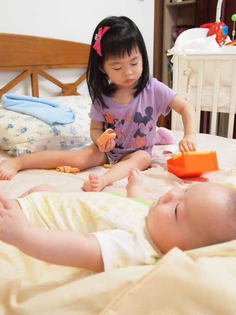 勳勳和乖姊的互動也很有趣。勳勳永遠喜歡小乖手中的玩具,我最近挖出一個寶寶玩的城堡積木要給勳勳玩,小乖似乎久違重逢,都霸佔著自己玩,看到勳勳靠近,就會大叫「媽媽,快點把底迪抱走,不要讓他過來」,可是乖姊,勳勳就是很崇拜妳嘛,看妳玩什麼都很好玩的樣子,想要跟妳一樣啊。