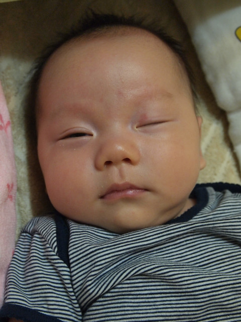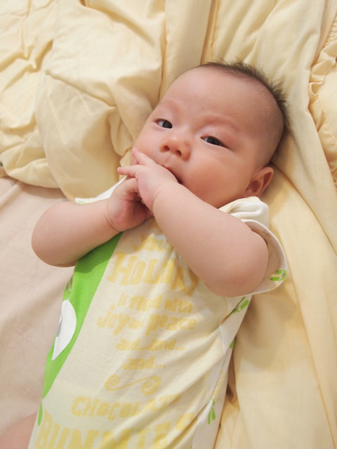 那天晚上,勳勳想睡唉唉哭,要我抱著他走動讓他入睡,我抱著勳勳跟他說,「要睡覺囉,電燈晚安、爸爸晚安、媽媽晚安、姊姊晚安、勳勳晚安」勳勳很安靜的聽不唉了,接著說到「緲喵晚安、小貓咪晚安」,勳勳「哼」的笑了一聲,把臉臉更深地埋到他的kaloo小貓咪裡面,然後我告訴他,「躺在枕頭上枕頭軟軟的很舒服喔,然後再蓋上像花瓣一樣很舒服很舒服的棉被」他就乖乖的讓我放下,閉上眼睛躺在床上睡覺,一會兒就睡著了。